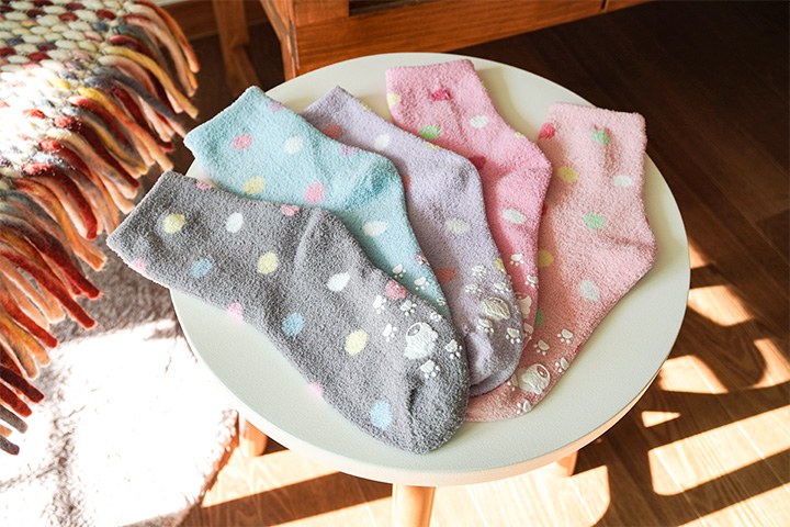 미끄러지지 않고 바닥과 발바닥을 고정시켜주는 기능이 있는데요, 할머니 선물로 애용되는 양말이에요.